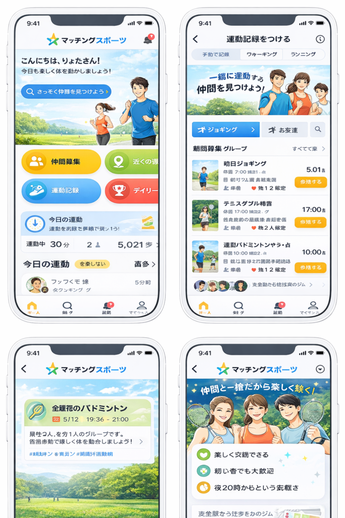 マッチングスポーツは、人とのつながり、運動の見える化、継続を後押しする仕組みによって、 誰もが無理なく運動を習慣にできる環境を提供します。