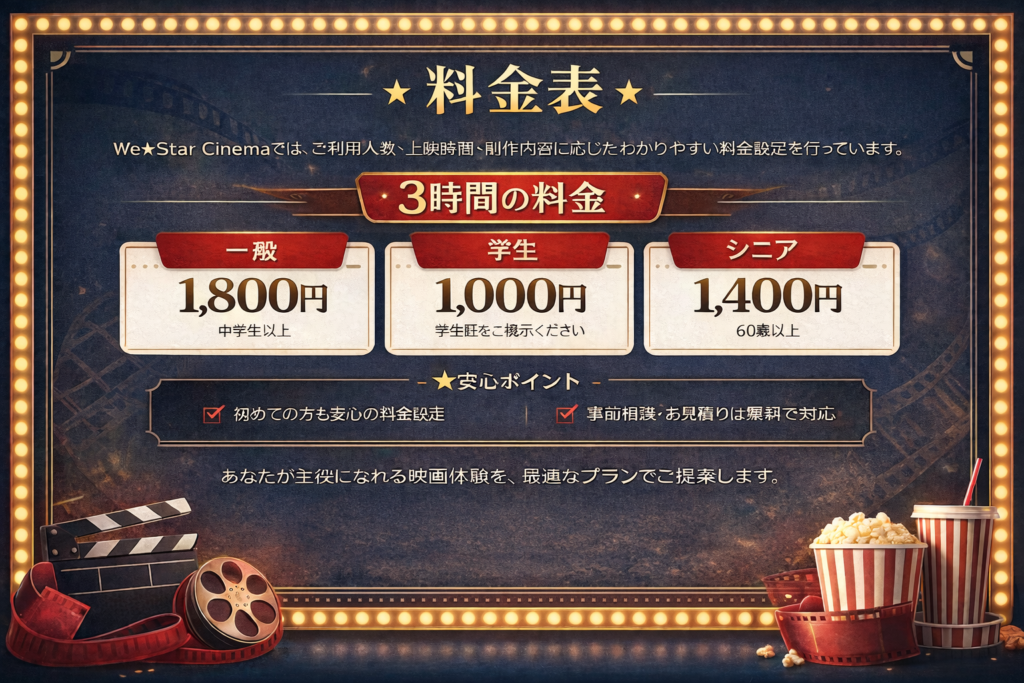 ご利用人数・上映時間・制作内容に応じた分かりやすい価格設定を行っています。
